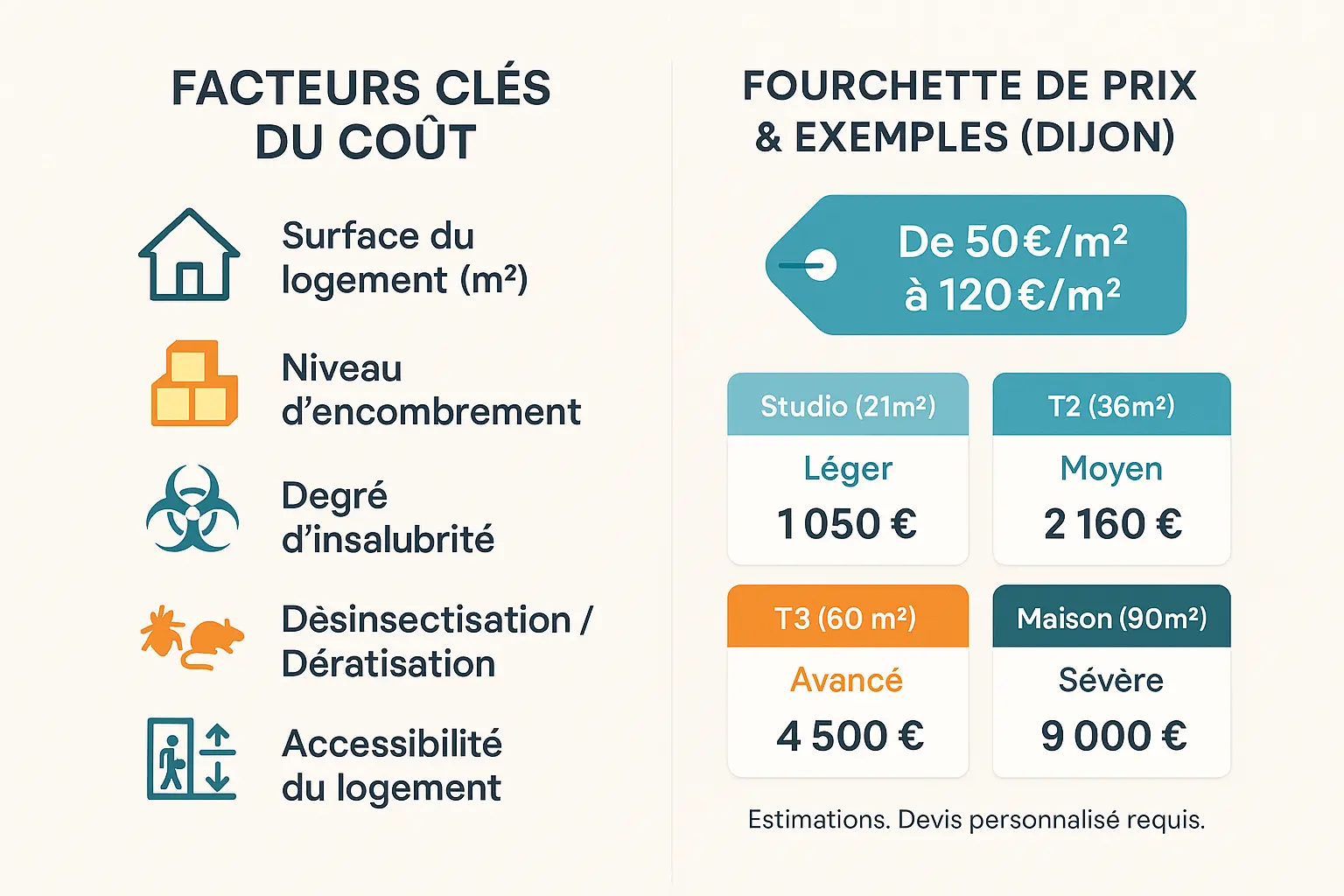 💡 Chiffres issus de cas réels à Dijon, mais seul un devis personnalisé fixe le prix. Il dépend de la configuration (ancien/récent), du volume à évacuer et des traitements (désinsectisation ≈ +300 €/pièce, remplacement de sols jusqu’à 2 500 €). Besoin d’un aperçu ? Voir l’infographie.